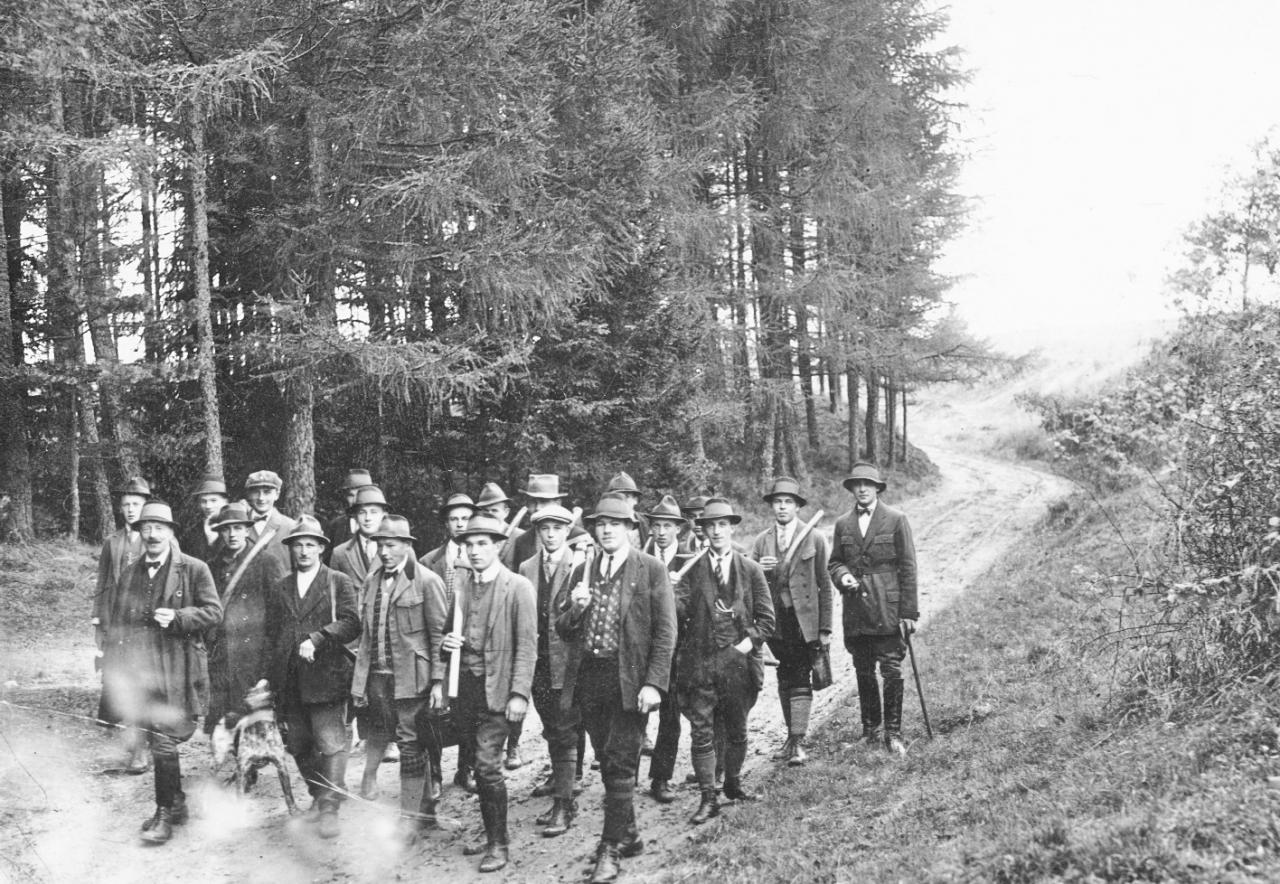 Žáci školy pro lesní hajné z Domažlic před praktickým cvičením v místním obecním lese. Postava se psem je místní obecní hajný Jiří Dufek z č. p. 32.