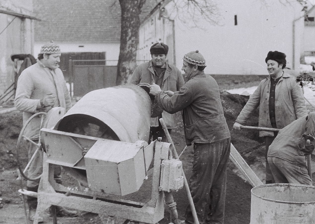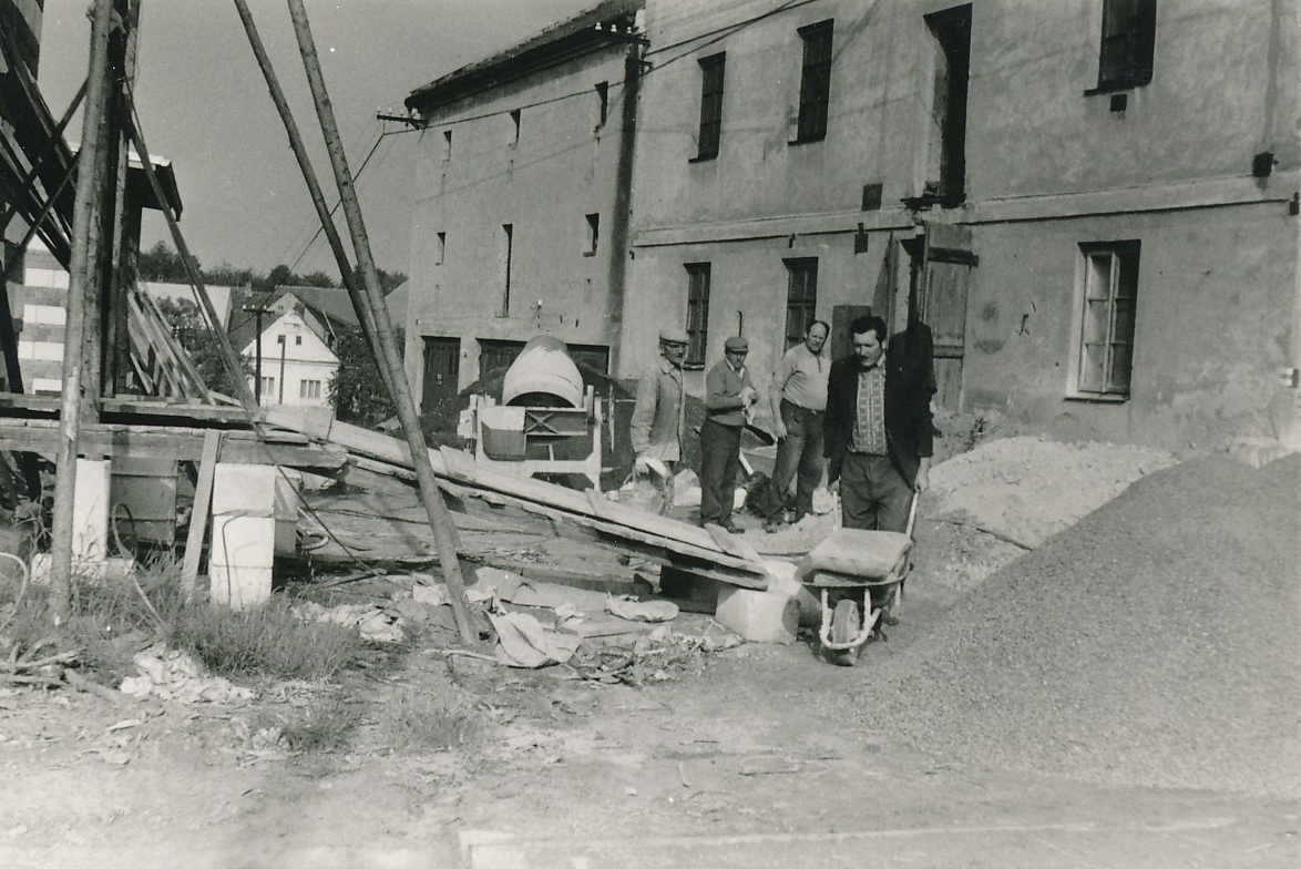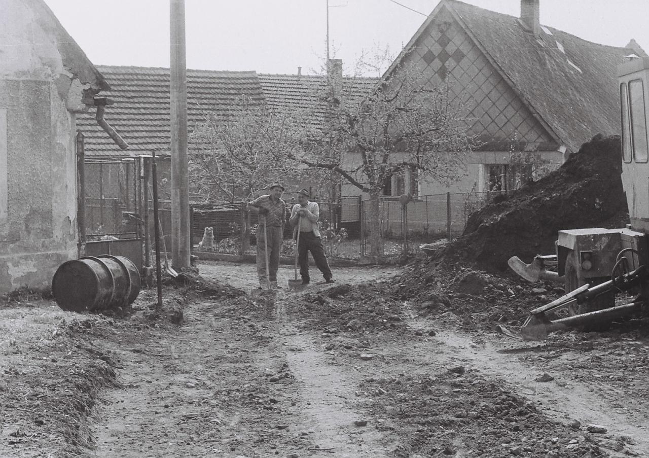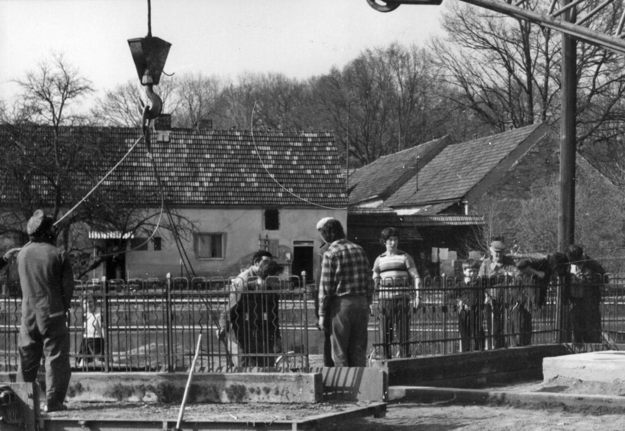 Práce na přístupové cestě k hospodě. Krátce před otevřením celého komplexu prodejna, hospoda, sál v roce 1984.