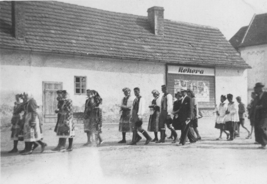 Slavnostní procesí doprovázející převoz ostatků sv. Vojtěcha v roce 1947. Snímek je pořízen na vjezdu do Chrastavic ze směru od Radonic.