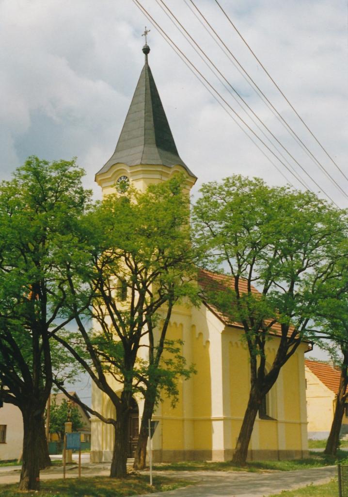 Kostel obklopený akáty po opravě fasády v roce 1998.