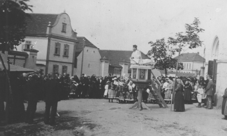 Mše před kostelem. Fotografie z doby kolem roku 1920.