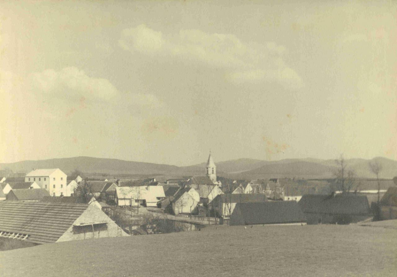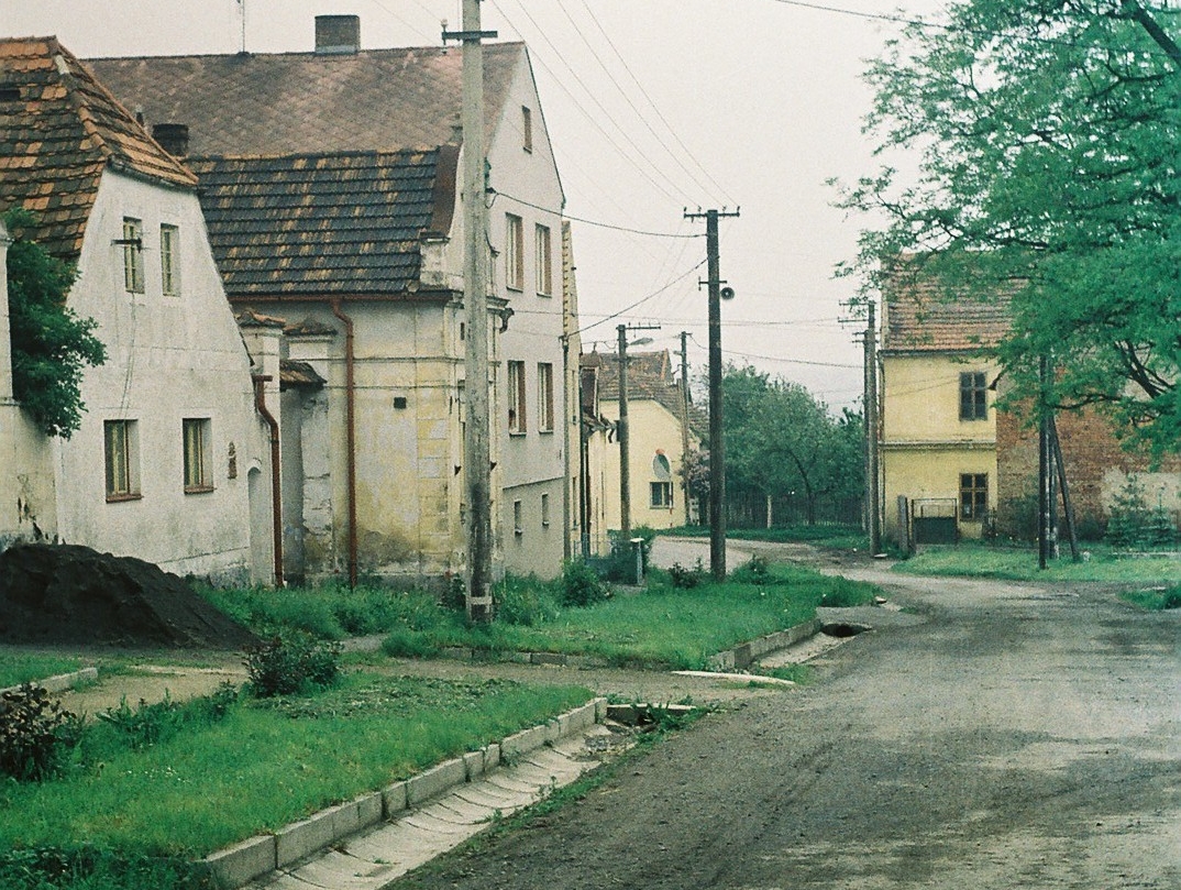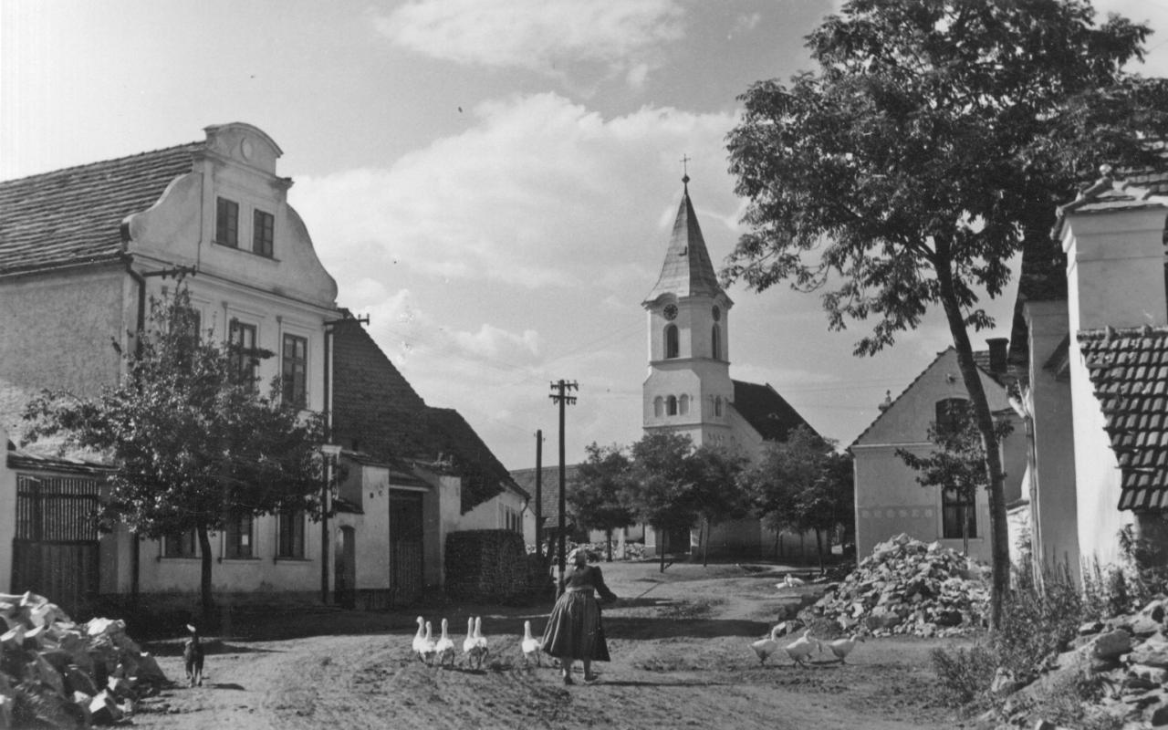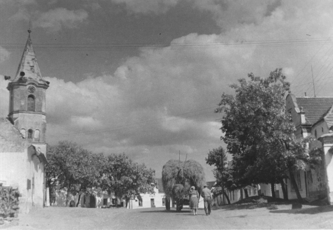 Pohled na cestu obcí z doby těsně po druhé světové válce.