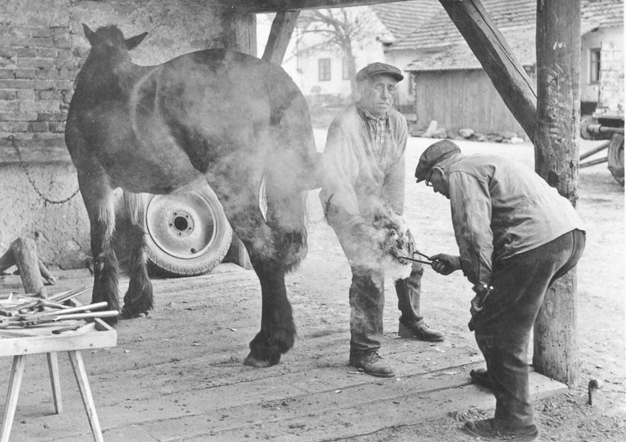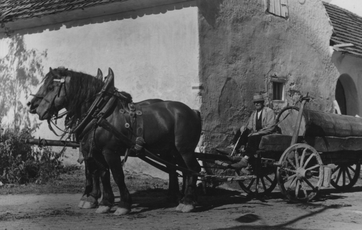 Hřebci v zápřahu z místního hospodářství U Němčů č. p. 18. Povoz mířící k práci na poli.