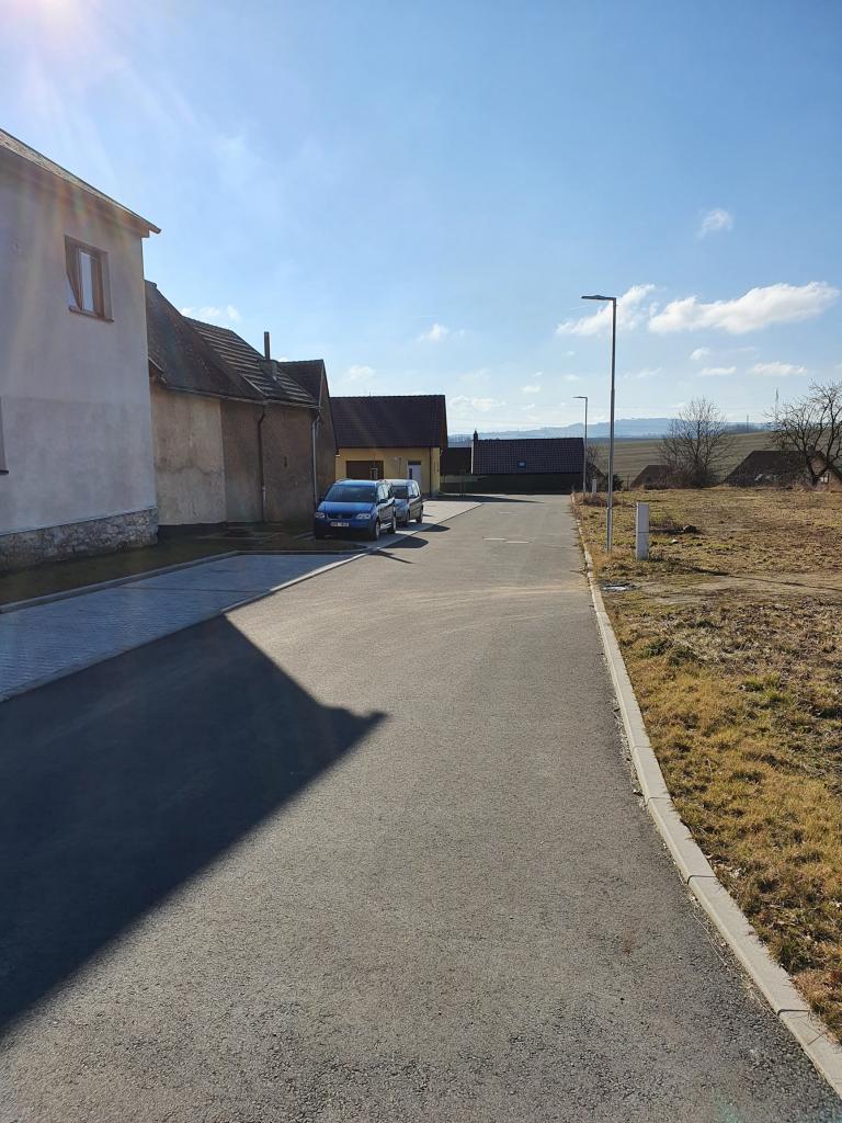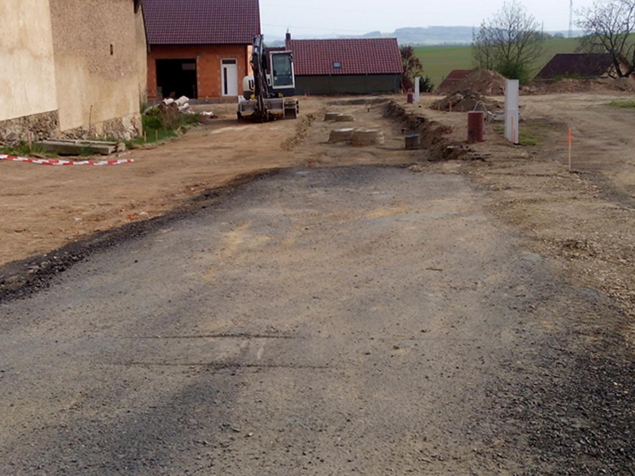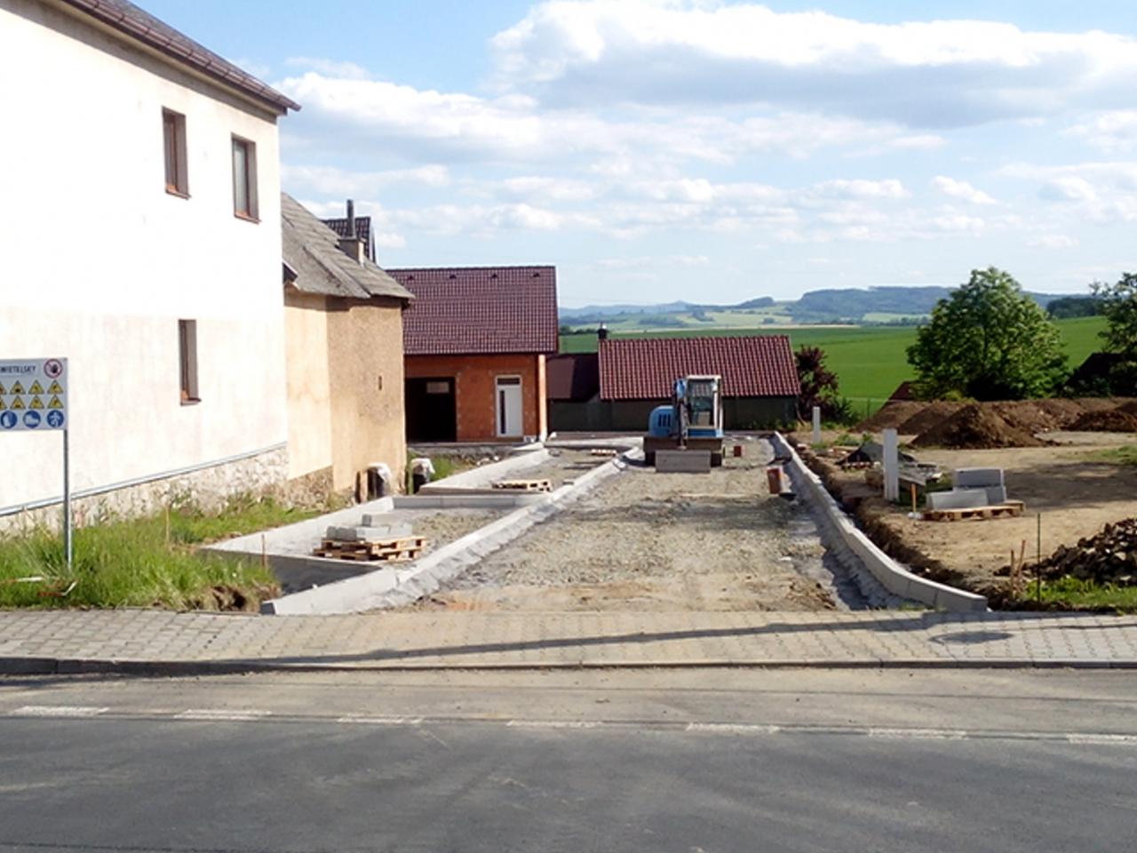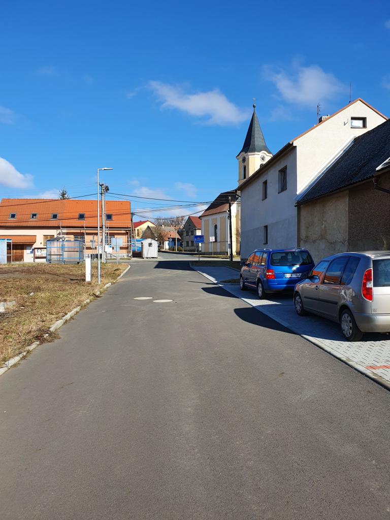 Fotografie z vybudování komunikace a parkovacích míst v nově vzniklé obytné zóně na návsi v roce 2020.