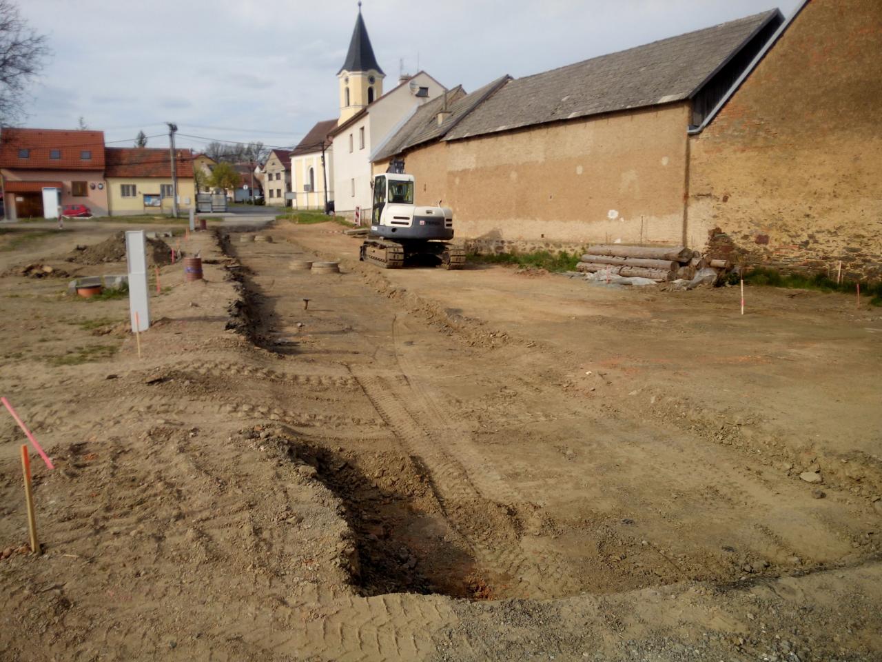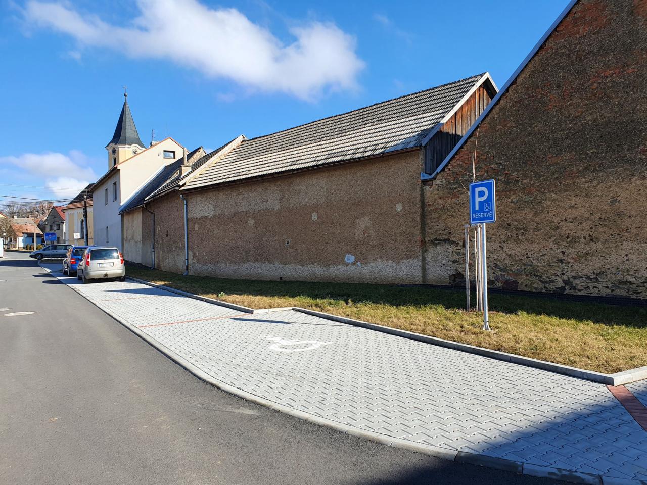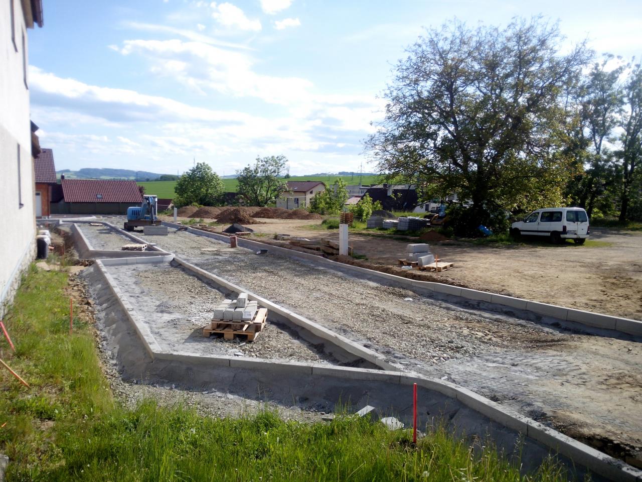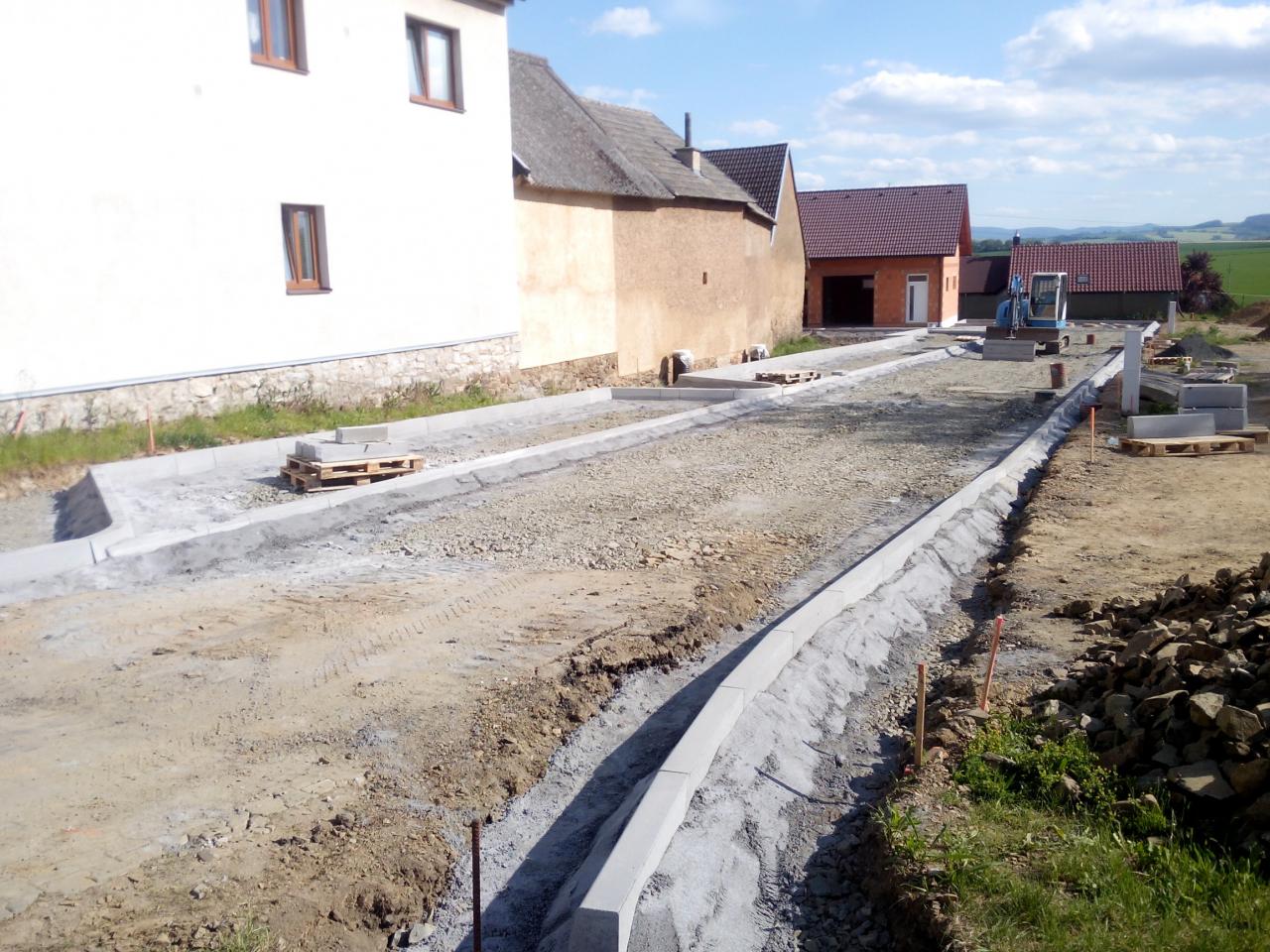 Fotografie z vybudování komunikace a parkovacích míst v nově vzniklé obytné zóně na návsi v roce 2020.