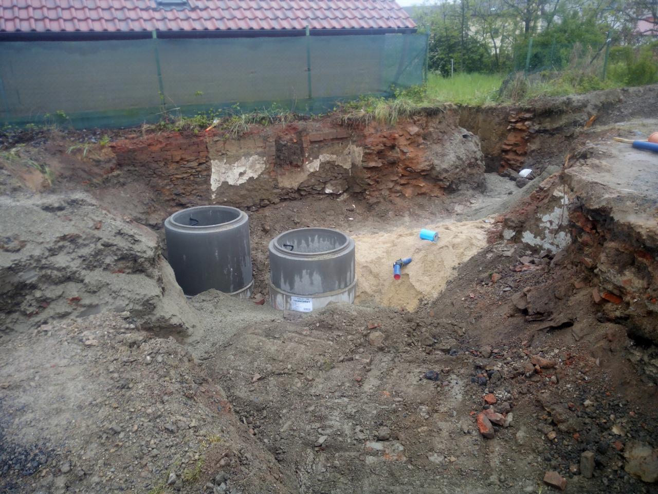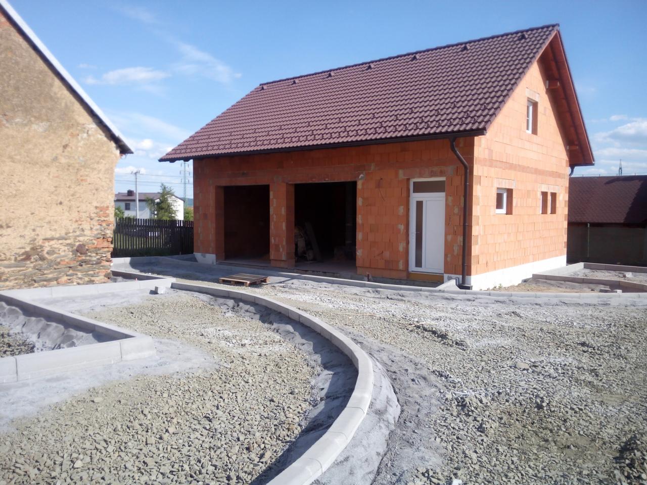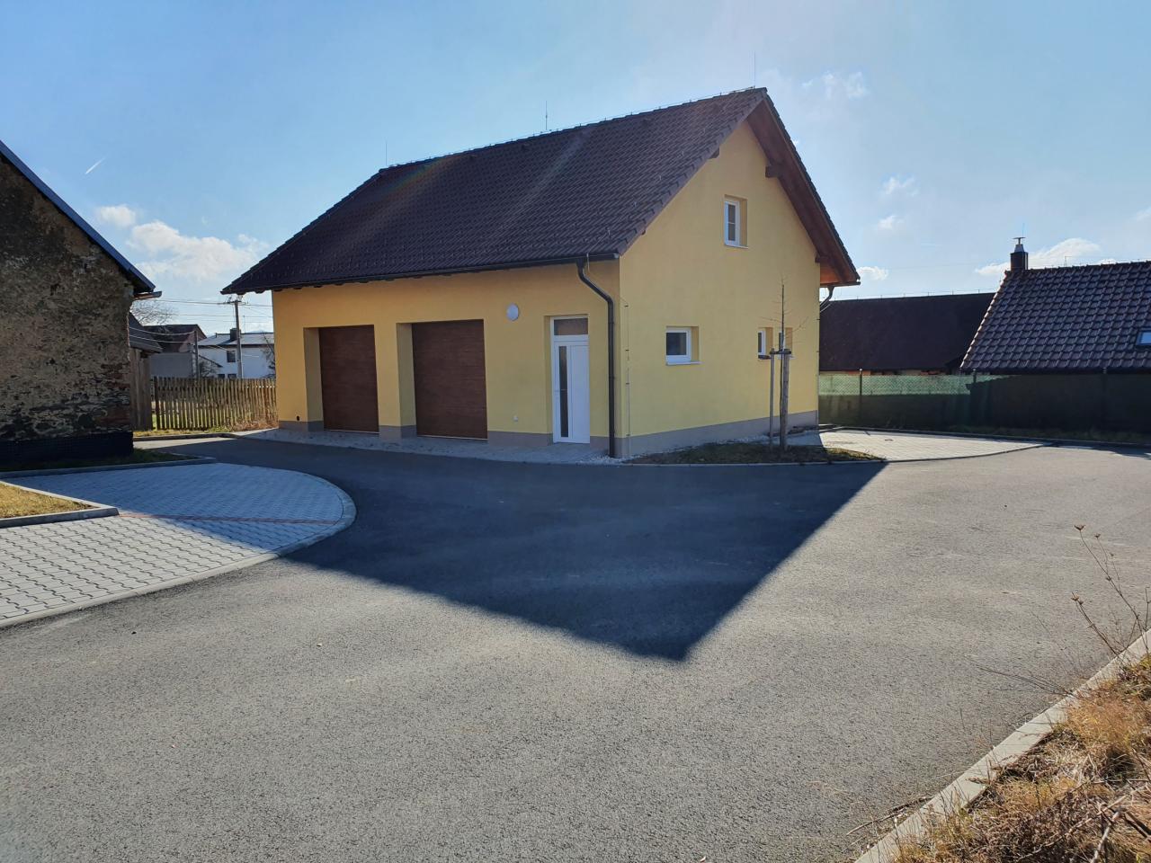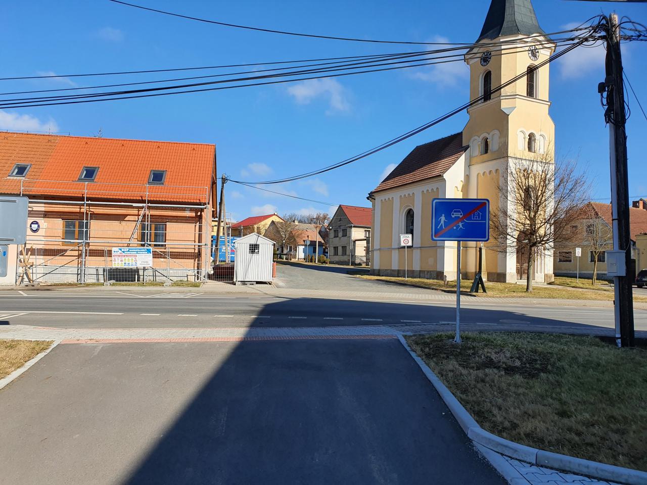 Fotografie z vybudování komunikace a parkovacích míst v nově vzniklé obytné zóně na návsi v roce 2020.