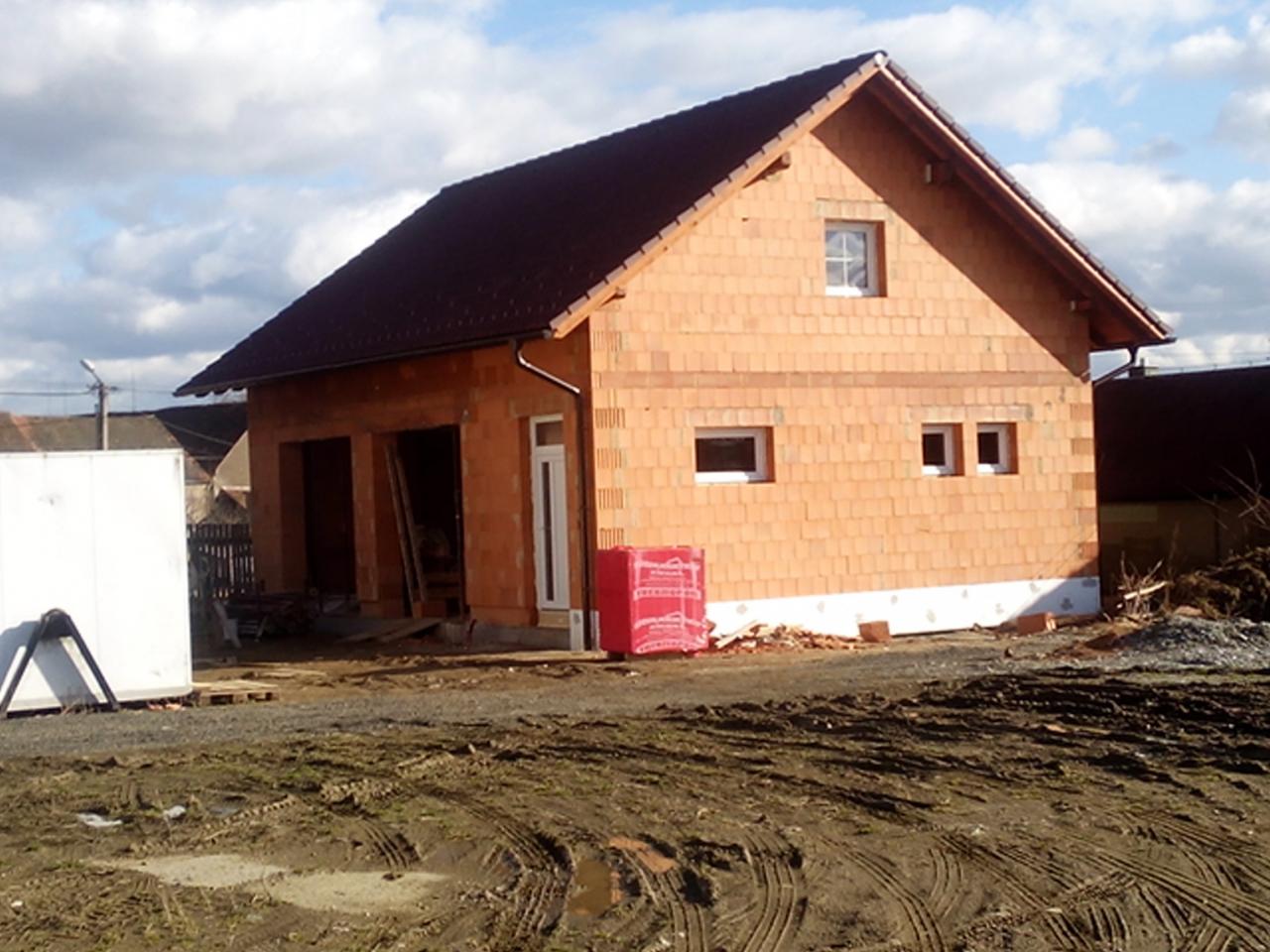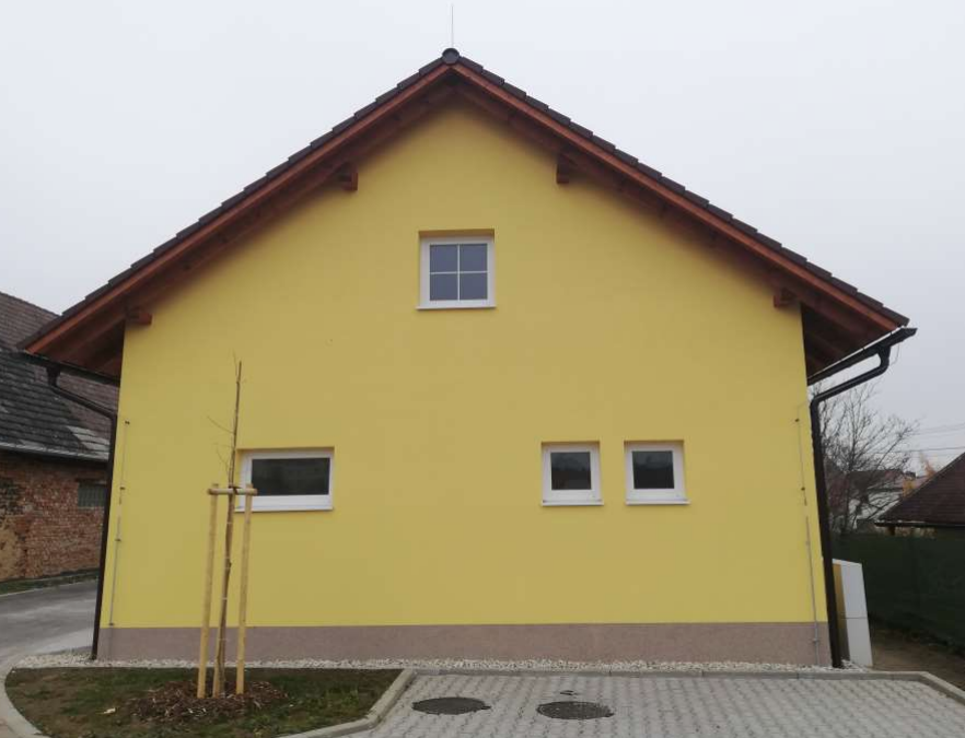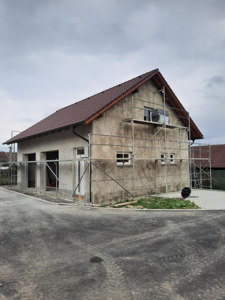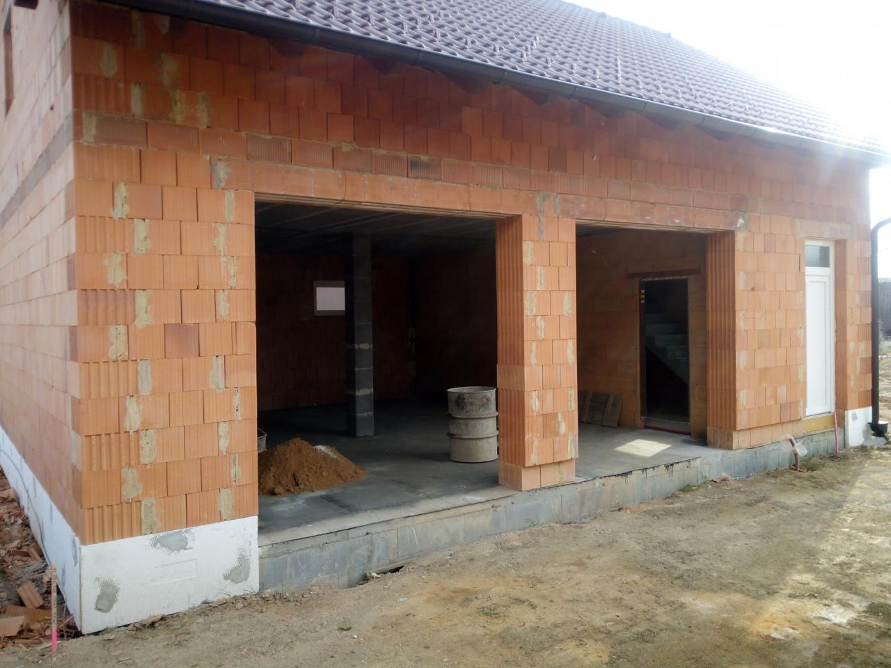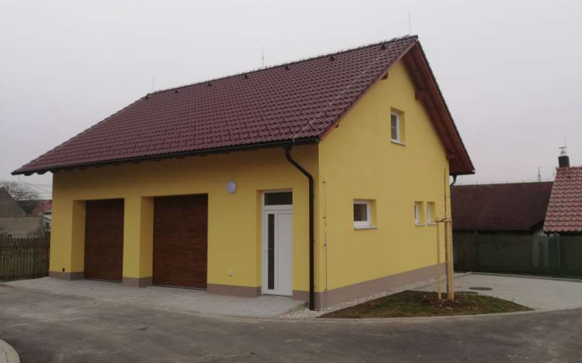 Fotografie z nově vznikajícího skladu a garáží obce v nově vzniklé obytné zóně na návsi na přelomu let 2019 a 2020.