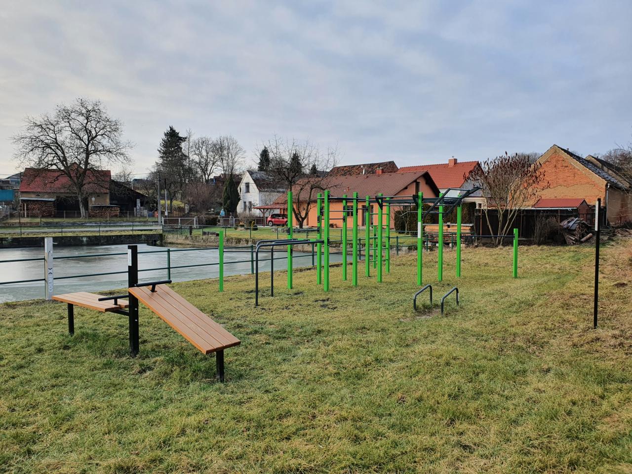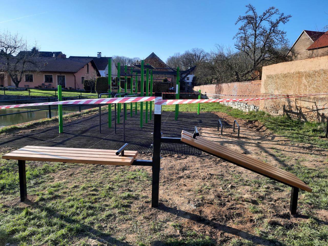 Fotografie streetworkoutového hřiště, které vzniklo v roce 2021 v lokalitě u vodní nádrže.
