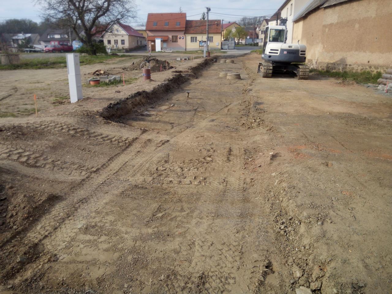 Fotografie z vybudování komunikace a parkovacích míst v nově vzniklé obytné zóně na návsi v roce 2020.